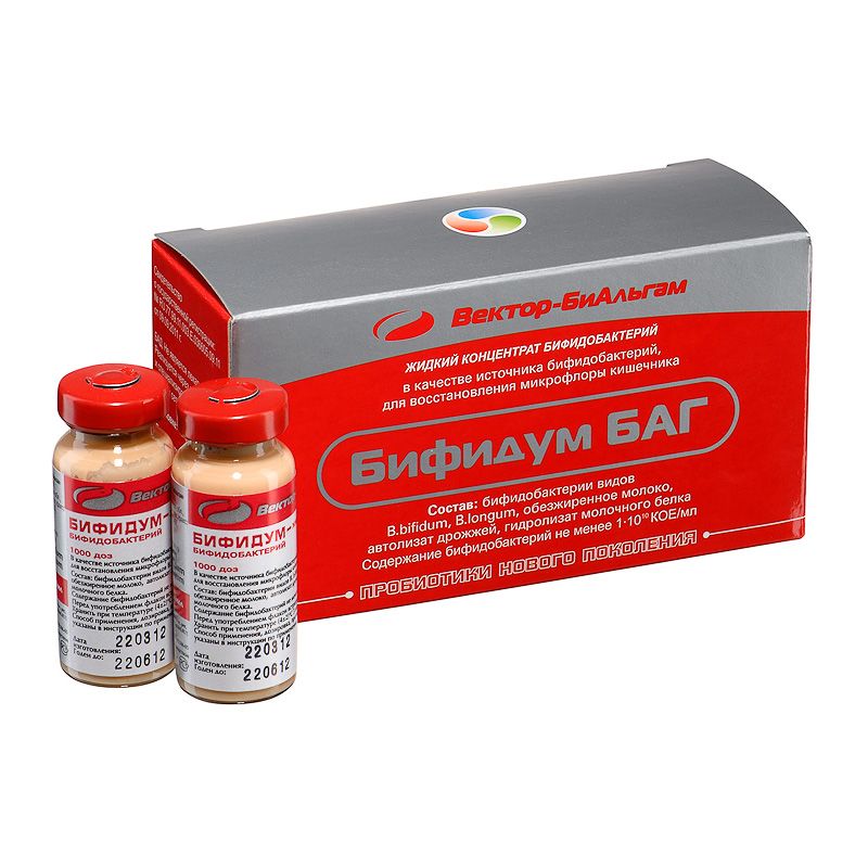 Бифидобактерий жидкий концентрат 1000 фармакопейных доз "Бифидум БАГ" - представляет собой комплекс антагонистически активных бифидобактерий видов B.bifidum и B.longum. В состав препарата входит 3 штамма бифидобактерий. Бифидобактерий жидкий концентрат 1000 фармакопейных доз "Бифидум БАГ" содержит в 1 мл до 1012 КОЕ/мл живых биологически активных клеток бифидобактерий на момент выпуска и не менее 1010 КОЕ/мл на конец срока годности